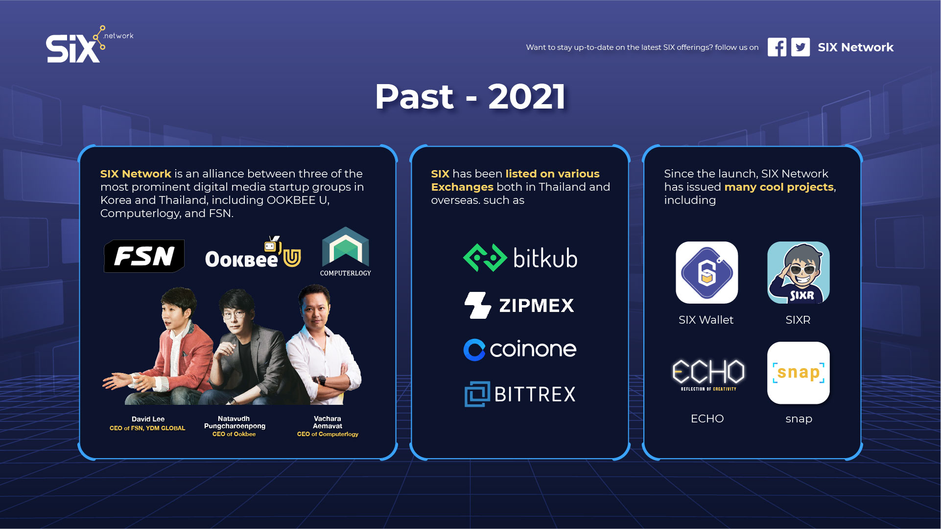 Since 2018, SIX Network has developed various projects such as SIX tokens, SIX Wallet, ECHO, snap, and SIXR, which are the first steps for SIX to use Blockchain technology and Metadata to develop projects. Furthermore, in 2021, SIX Network released its latest Defi platform called “Definix.”
