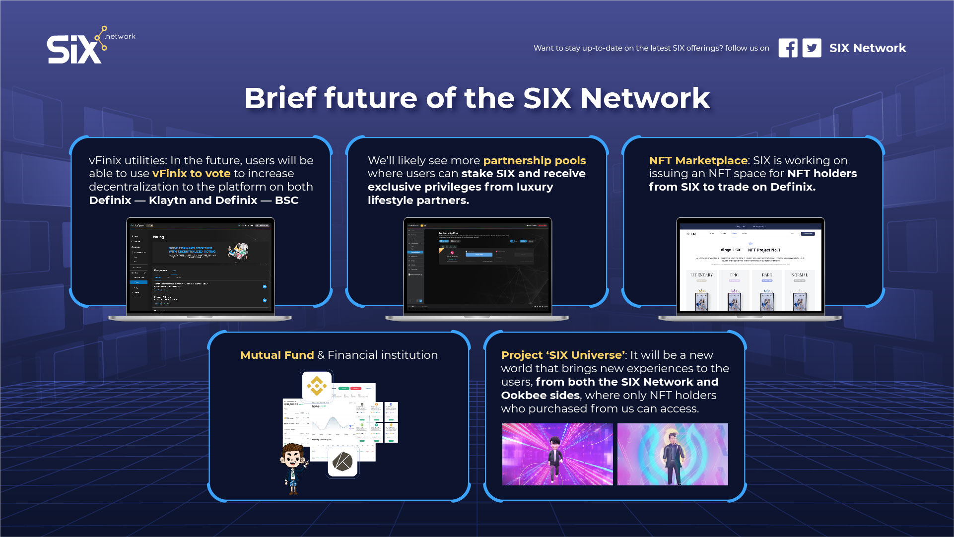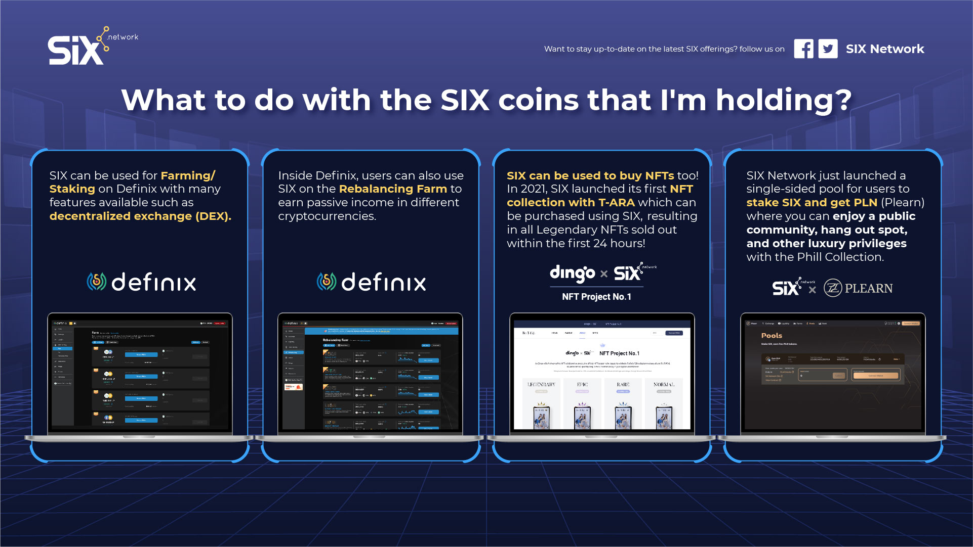 • NFT Marketplace: SIX is working on issuing an NFT space for NFT holders from SIX to trade on Definix.