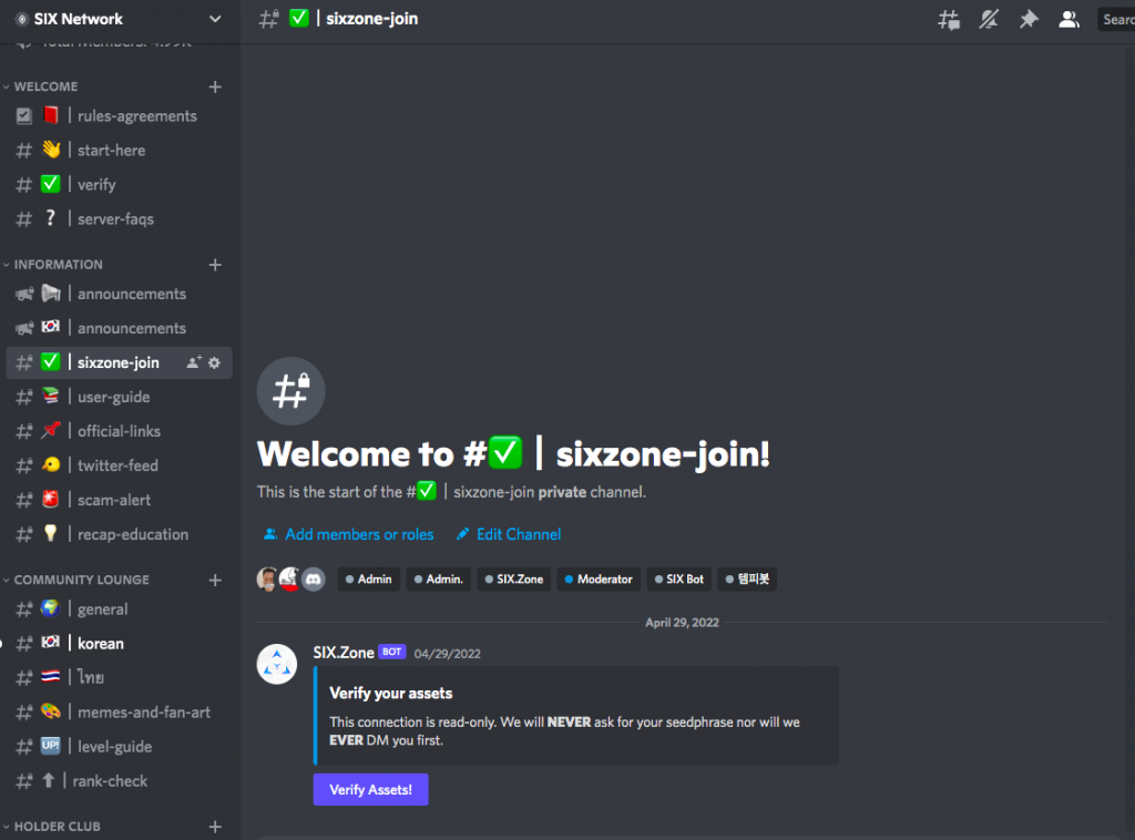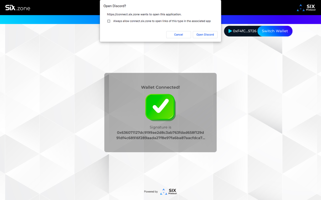 #6 After going through all the steps, you will see that your Wallet has been connected, click Open Discord, and you will now be in the Holder Club of SIX Network Discord.