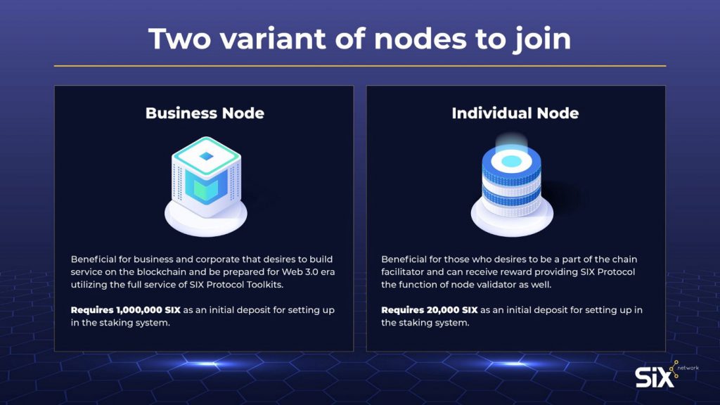 The criteria required to set up Business Node Validator respectively using a big amount of 1 million SIX tokens to stake in the system, but in contrary with the possibilities and functionalities to scale up the business to Web 3.0 is a reasonable investment price.